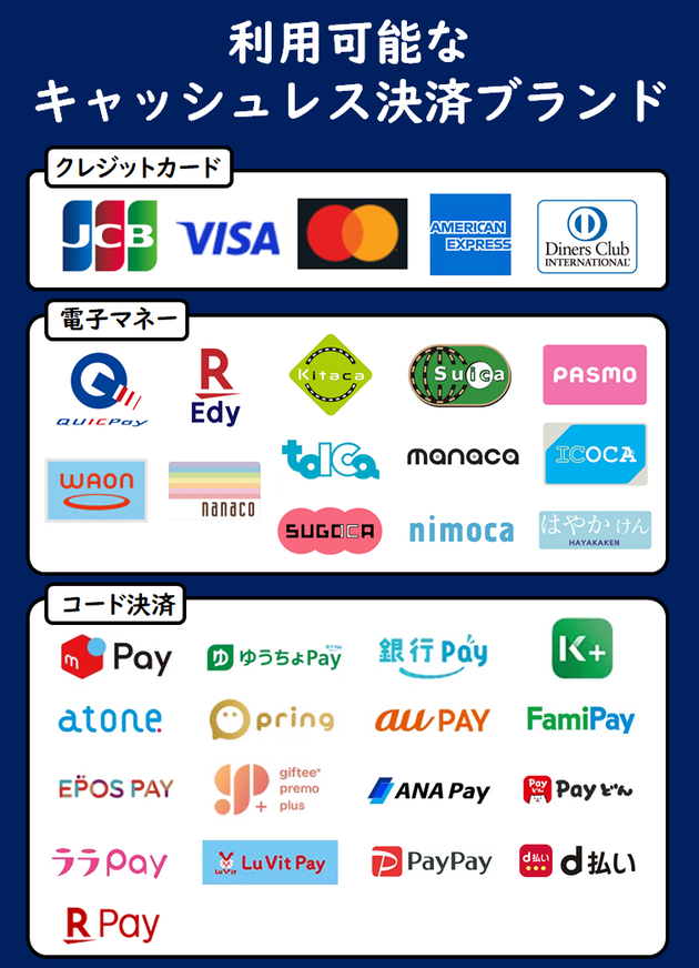 当店のお支払いは次の方法です。一部のキャッシュレスサービスが使用できないものがあります。